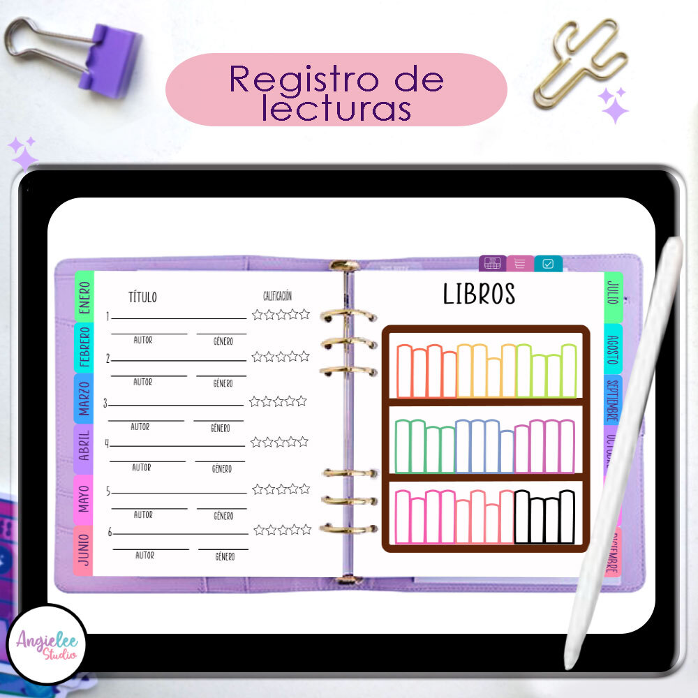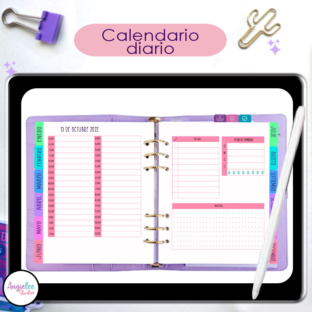 Agenda digital 2022 (Angielee studio) Portada lila con pestañas multicolores.